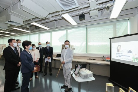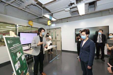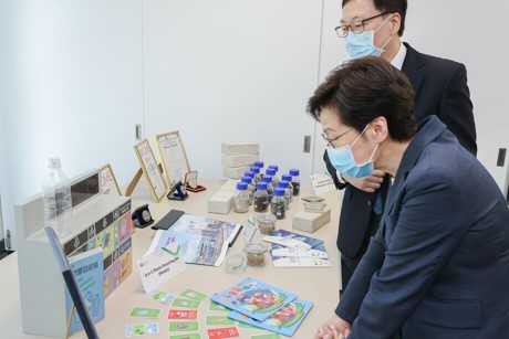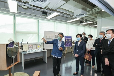 Accompanied by Council Chairman Dr David Wong Yau-kar and President Professor Stephen Cheung Yan-leung, the Chief Executive was given an introduction of the University’s start-up, research and innovation projects as well as eco-friendly inventions.