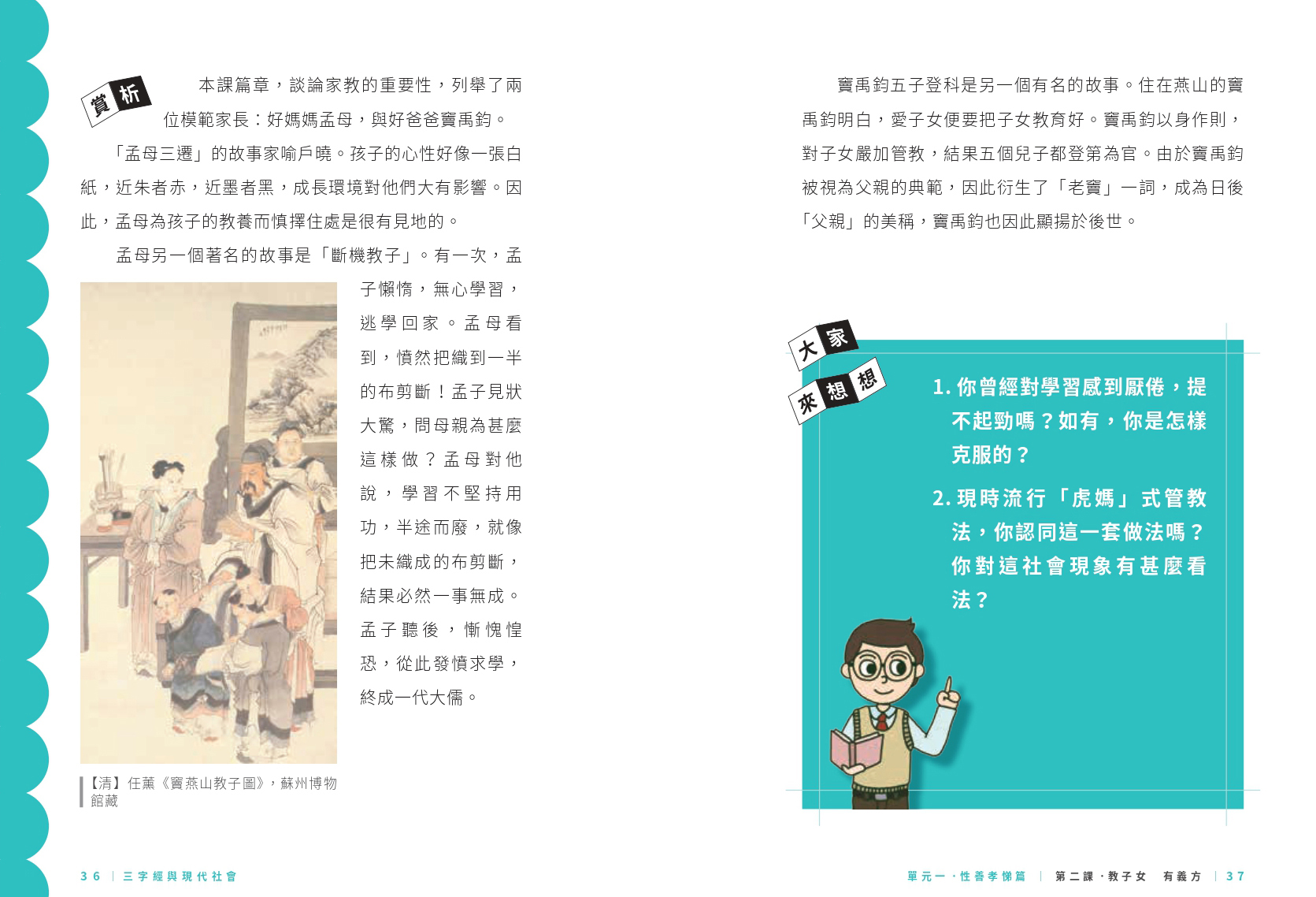 The research team compiled the experimental teaching materials into Three Character Classic and Modern Society with interesting illustrations and Cantonese and Putonghua audiobooks. Divided into eight sections, each section contains between five and seven chapters, each covering “Story”, “Knowledge”, “Explanation”, “Translation”, “Appreciation” and “Extended Questions for Reflection”. The book invites readers to reflect on questions that are connected to modern society, and how they can be applied to our daily lives.