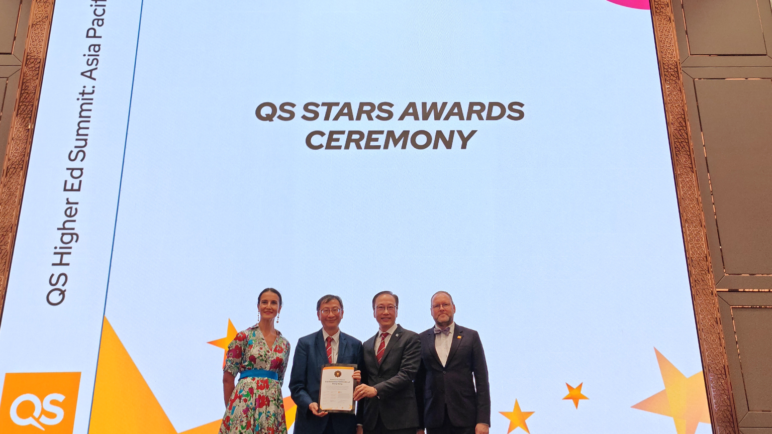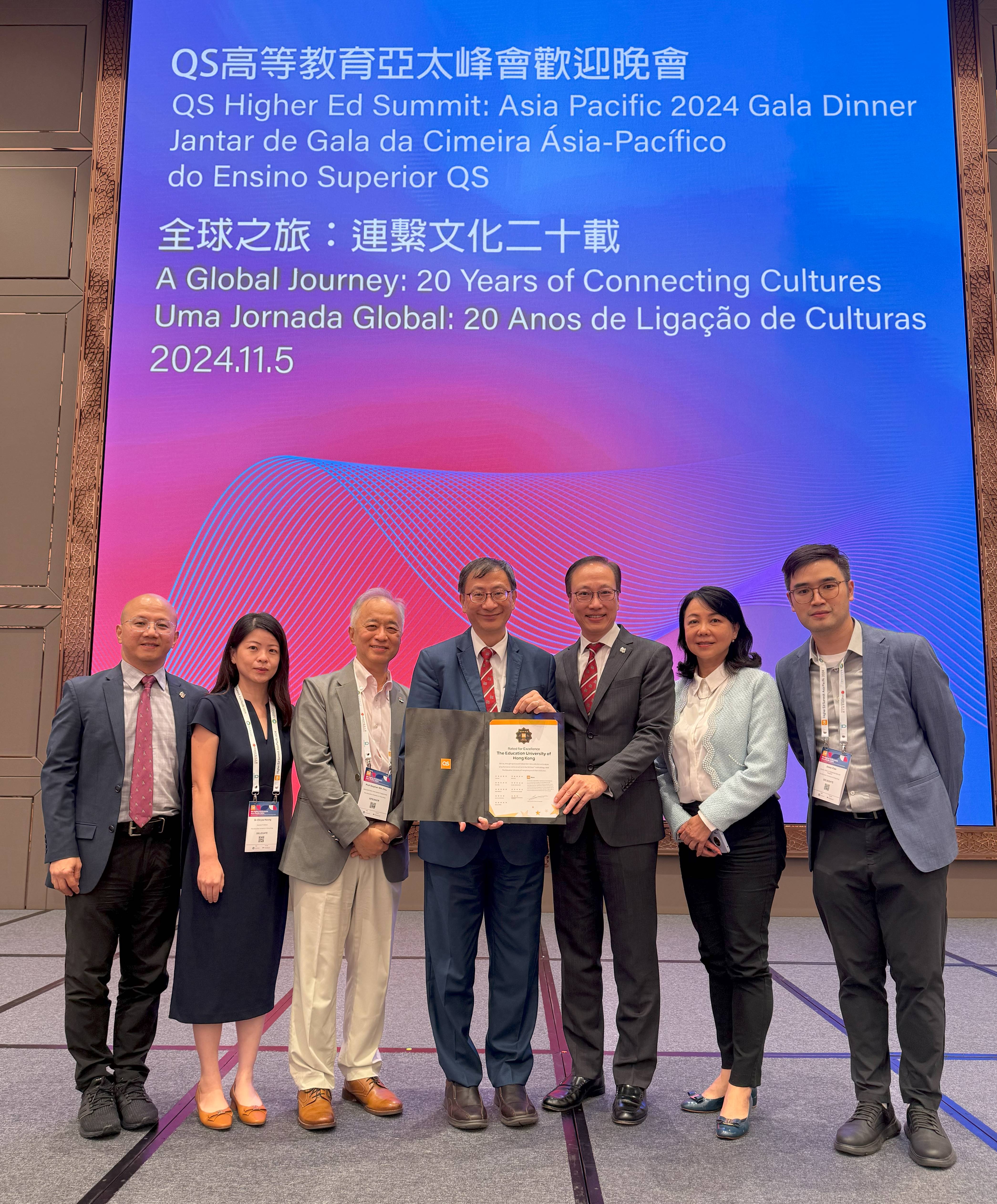 Professor Lee and Vice President (Research and Development) Professor Chetwyn Chan Che-hin attended the Gala Dinner for the QS Higher Ed Summit Asia Pacific 2024 held on 5 November, where they officially received the 5-Star Institution certificate.