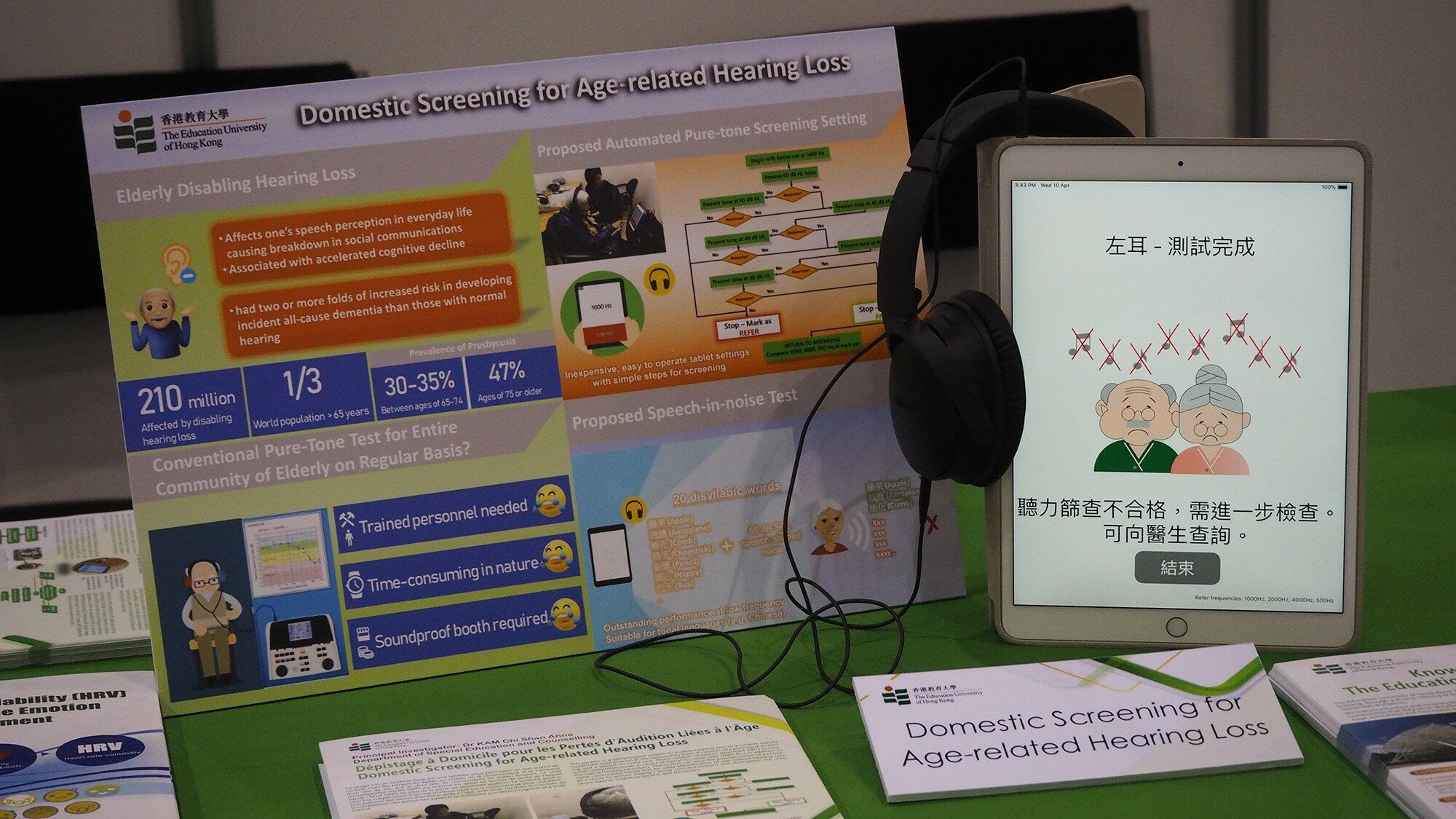 This project developed a tablet-based system to enable a hearing test as a routine elderly healthcare exam at the community level. It consists of pure-tone screening and a speech-in-noise test. The system is expected to spur the popularisation of a convenient community-based test for early identification of age-related hearing loss.